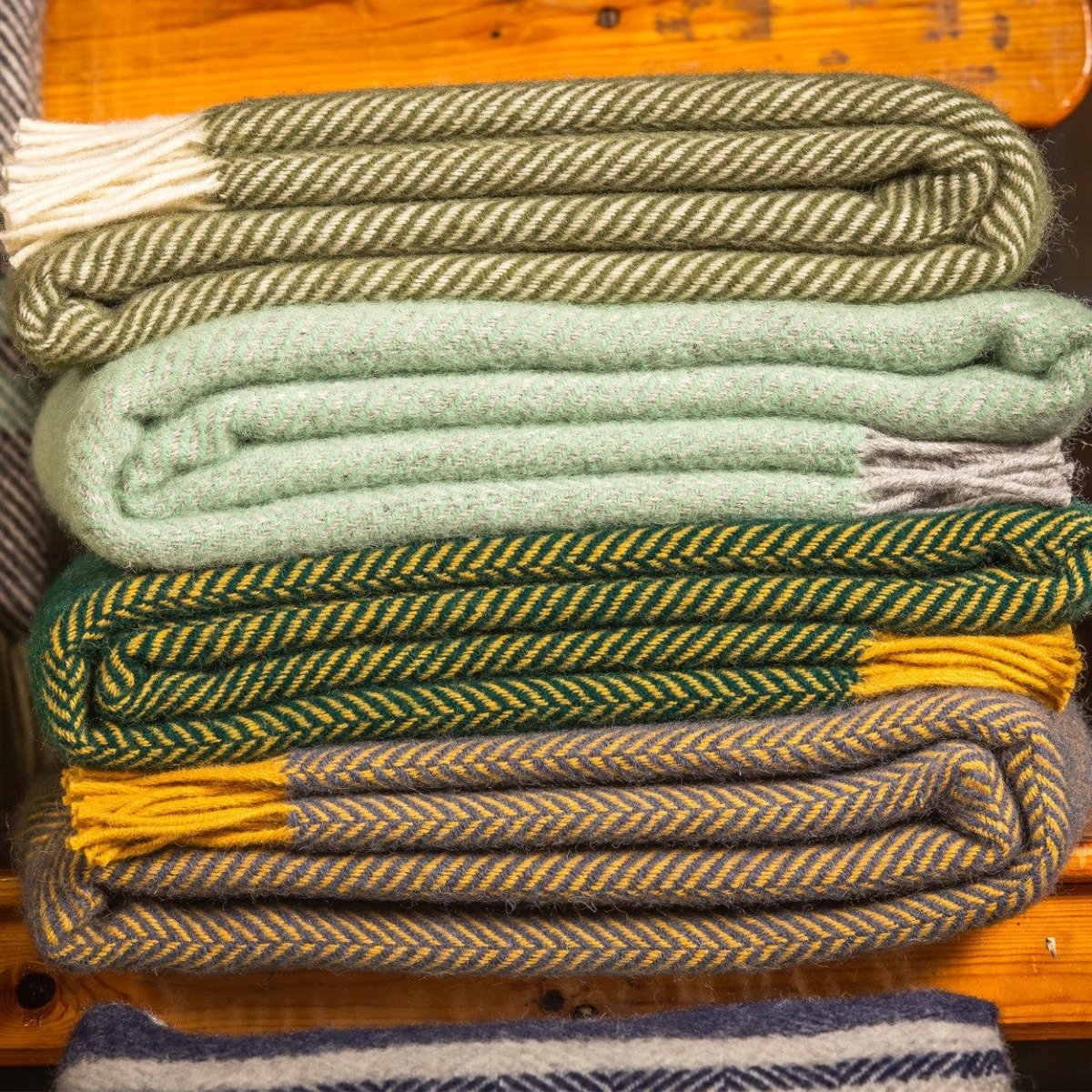 Plaid Visgraat Blauw en Mosterd geel - 150x183 - Nieuw Wol - Tweedmill UK