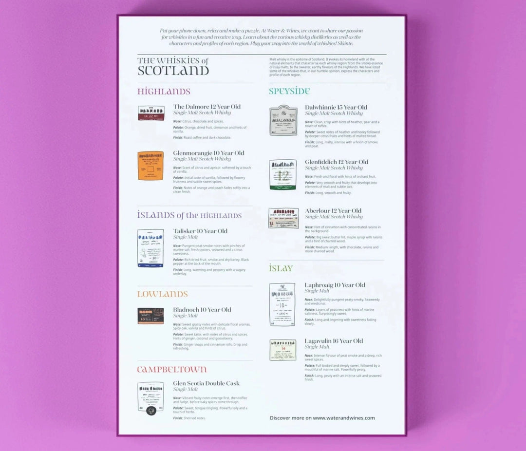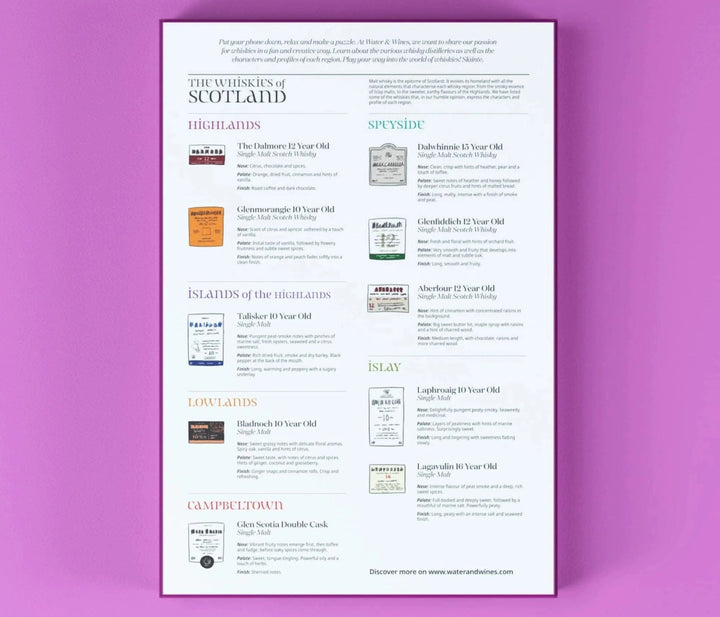 Of je nu op zoek bent naar een bijzonder cadeau voor een vriend of gewoon een moment van rust en ontspanning voor jezelf wilt creëren, deze puzzel biedt de ideale gelegenheid voor slow living. De extra inhoud in de doos, met een introductie tot het proeven van whisky, nodigt je uit om je zintuigen te prikkelen en te genieten van elk detail. Terwijl je de puzzel voltooien, ontdek je niet alleen de kaart van Schotland, maar ook de verhalen achter de iconische distilleerderijen die deze unieke drank maken.